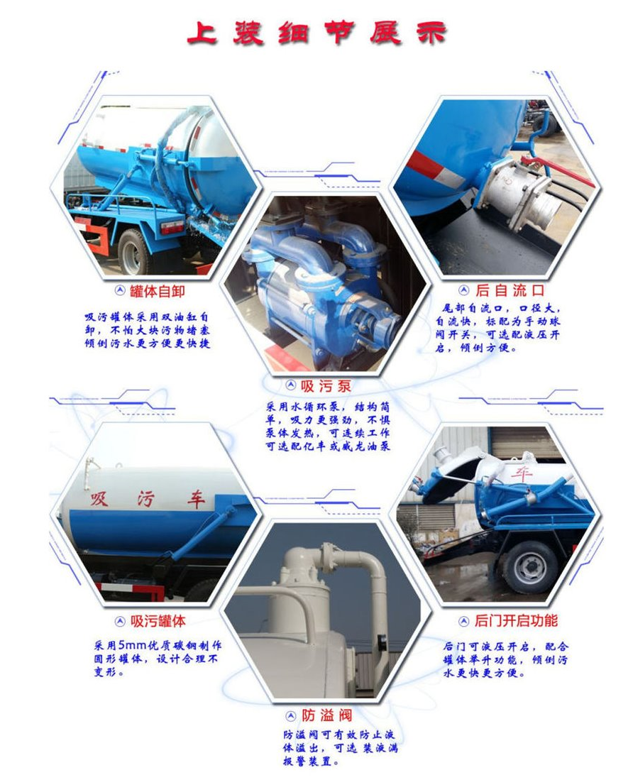 10方東風多利卡D9吸污車上裝罐體采用Q235國標6mm優質碳鋼鋼材制作,配置水循環泵,泵可自吸自排,真空度高,吸程遠;安裝防溢閥網裝置,預防抽滿罐了,防溢閥后面的濾網可以再過濾一次,相當于起到二次保護;一個防溢閥,加粗型視糞亮管,罐體可液壓舉升自卸,后蓋可液壓打開,一個自流口,一根8米的吸污管。
